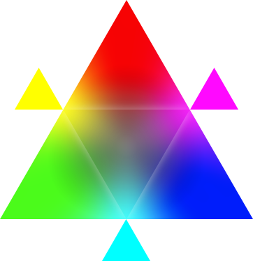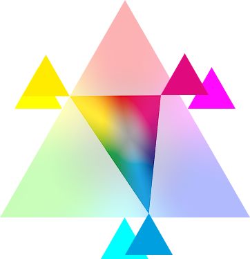 Hoe erg de afwijking is, zie je pas als je het hele spectrum bekijkt. In de eerste illustratie zie je wat ik bedoel. De grote driehoek heeft rood, groen en blauw als uiterste punten. Daartussenin zie je ideaal cyaan, magenta en geel. Als je die als mengkleuren gebruikt, is de driehoek al veel kleiner; qua oppervlakte een kwart van de rood/groen/blauw-driehoek. En zelfs die driehoek is groter dan wat we met de werkelijke drukinkt-kleuren kunnen mengen, zoals je ziet in de tweede illustratie. Ook zie je in illustratie 3 de ‘echte’ kleuren en hun ‘full-colour’-surrogaat.